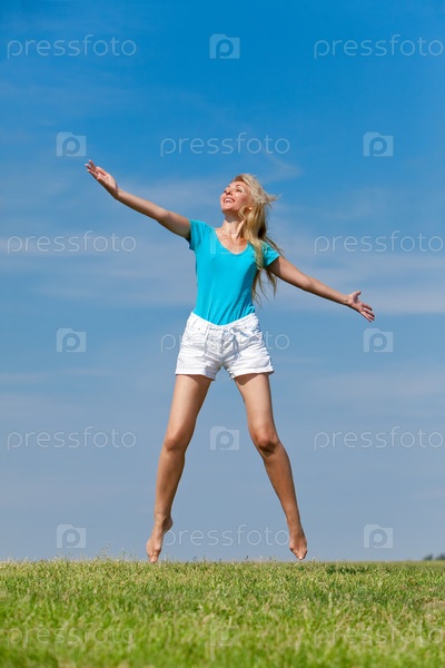 Счастливая молодая женщина прыгает в поле