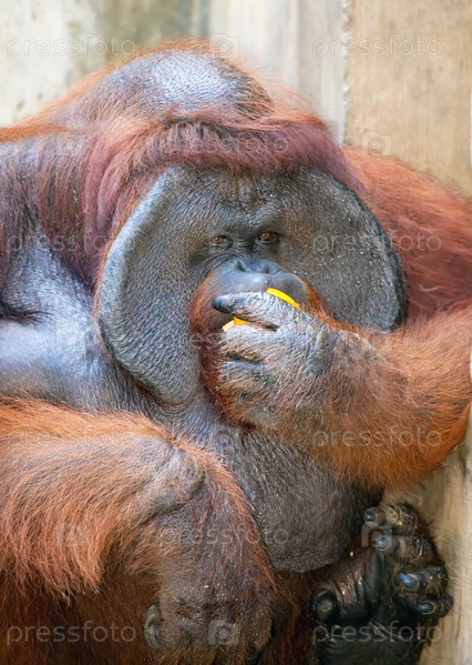 Большой орангутанг ест апельсин