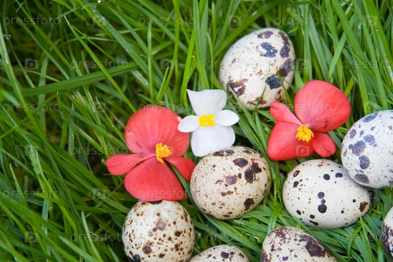 Перепелиные яйца и цветы на зеленой траве