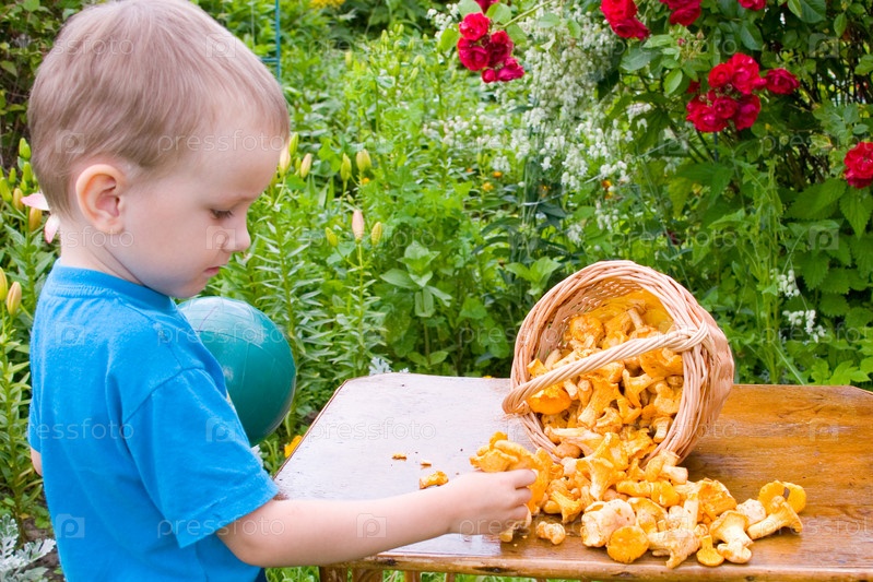 Мальчик с грибами в летнем саду