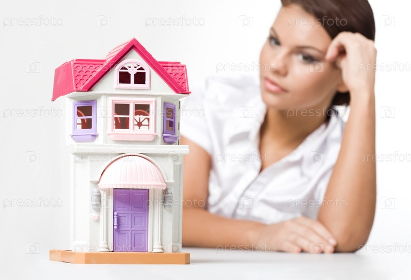 Миниатюрный игрушечный дом с женщиной-мечтательницей, которая смотрит на него рядом