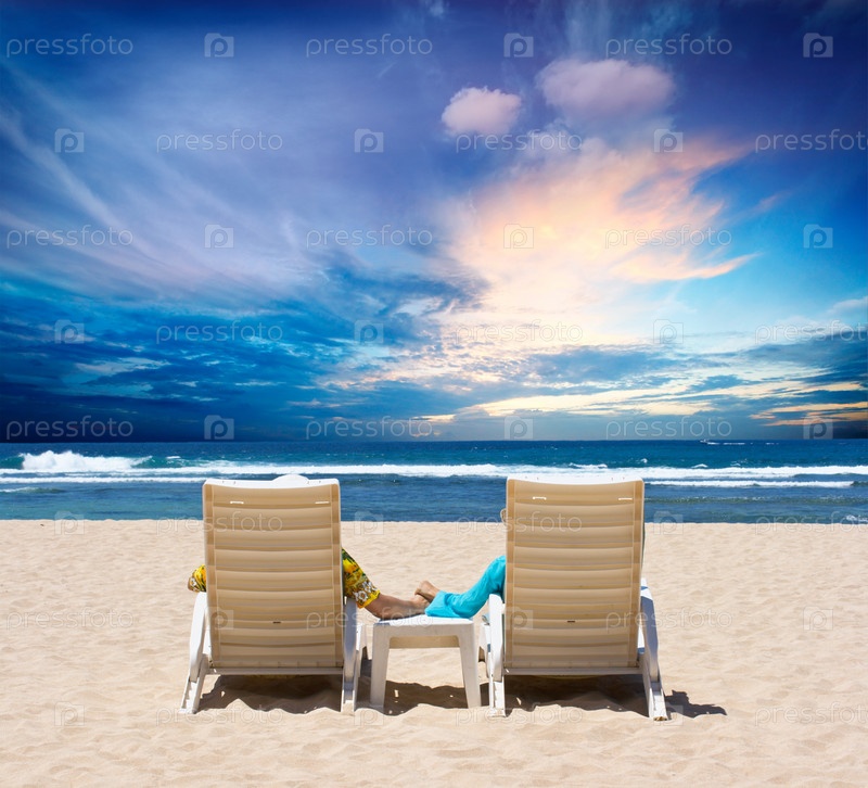 Молодожены на пляже наслаждаются закатом над океаном