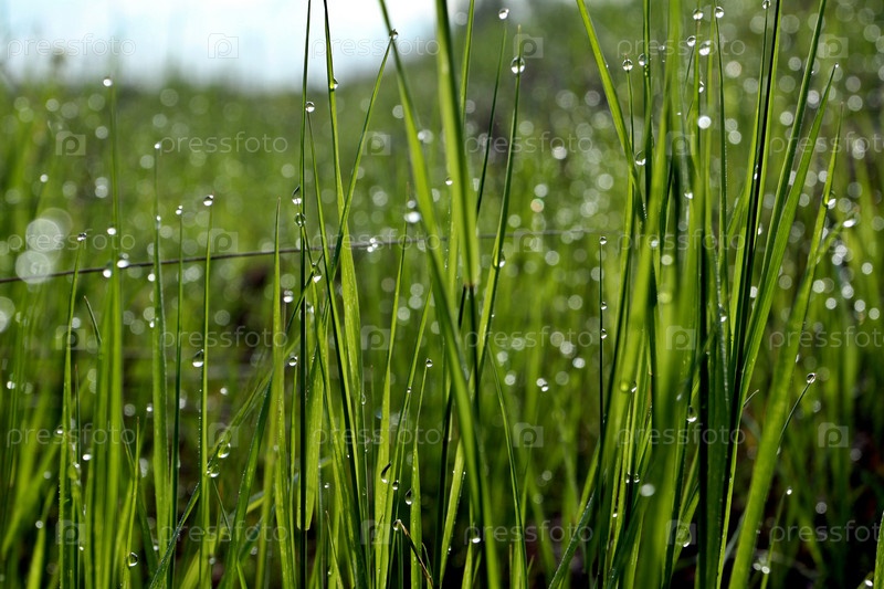 Раннее утро, капельки росы на траве. Пенза, июнь