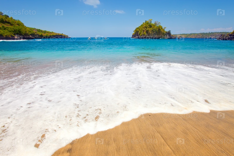 Вид с пляжа на скалы в океане. Индонезия, Бали