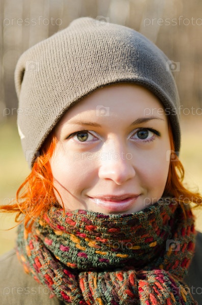 Портрет симпатичной рыжеволосой девушки в теплой осенней одежде