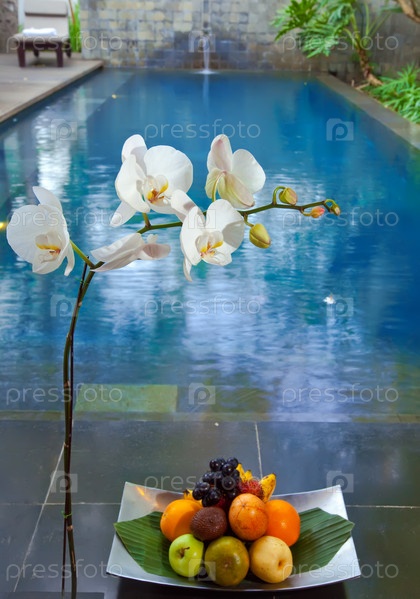 Цветущая орхидея рядом с вазой полной тропических фруктов на фоне бассейна