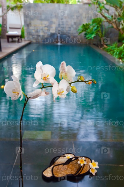 Цветущая орхидея рядом со сланцами на фоне бассейна