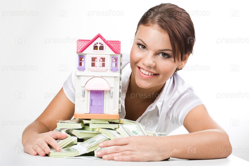 Портрет счастливой женщины, собирающей кучу денег с игрушечным домом на вершине