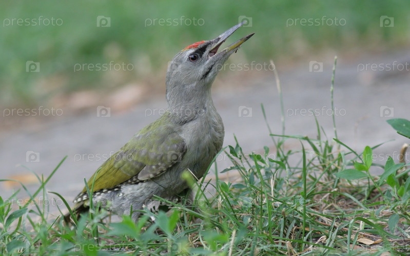 Серый дятел сидит в траве