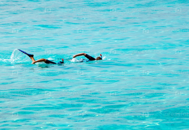 Мужчины в маске с трубкой плавают в океане
