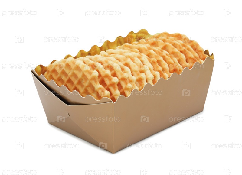 Вафли в бумажной коробке на белом фоне