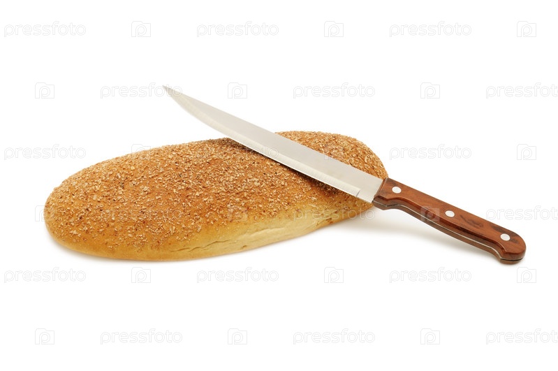 Свежий хлеб и кухонный нож, изолированные на белом фоне