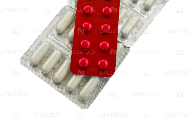 Белая и красная упаковки с таблетками на белом фоне