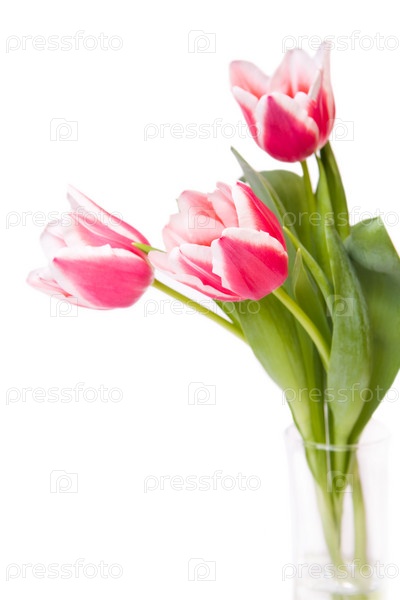 Фото трех свежих тюльпанов в стекле на белом фоне