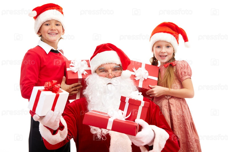 Санта-Клаус с подарками и счастливые дети