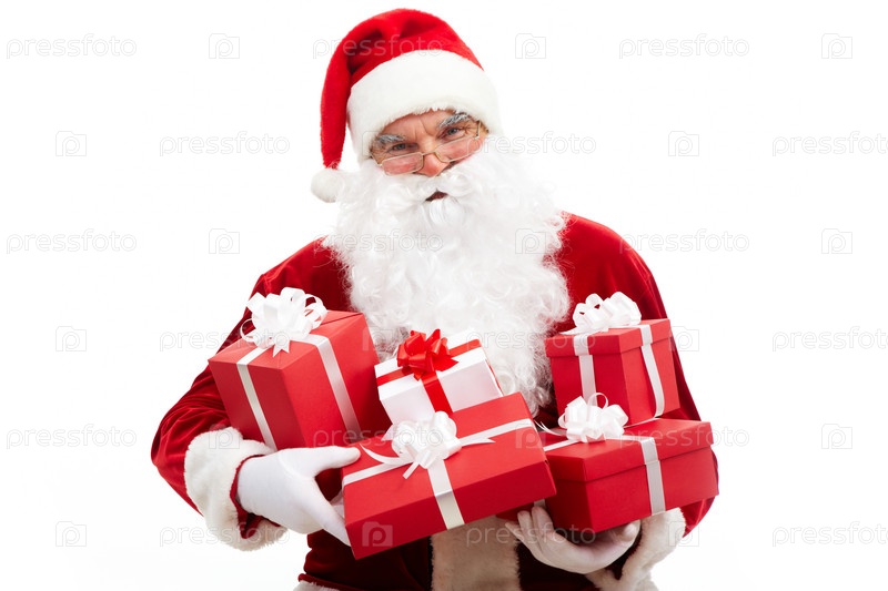 Санта-Клаус с подарками на белом фоне