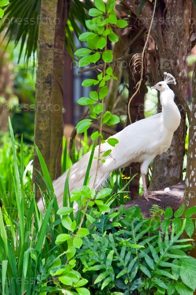 Белый павлин среди зеленой листвы