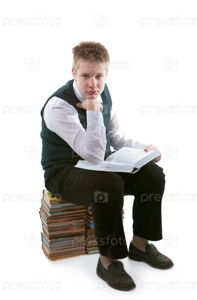 Школьник в школьной форме сидит на стопке книг с открытой книгой в руках