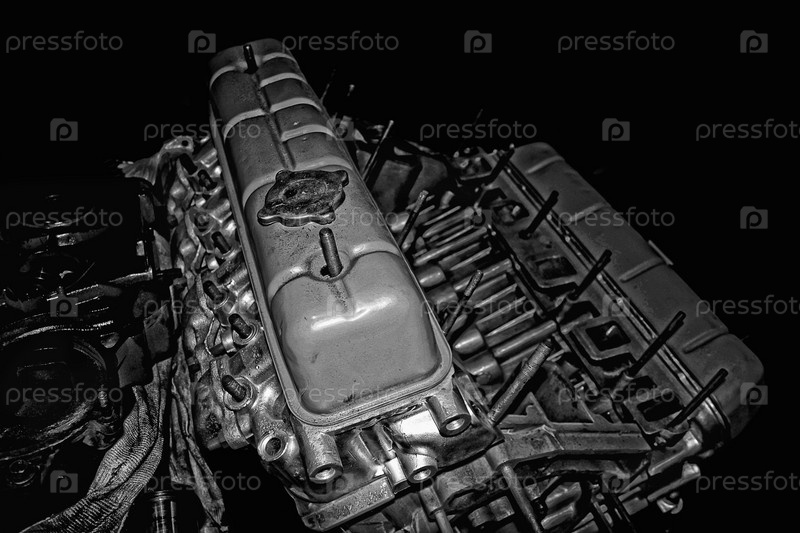 Двигатель V8 в разобранном виде на черном фоне