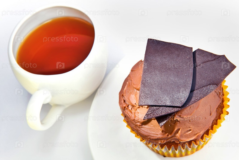Шоколадное пирожное и чашка чая