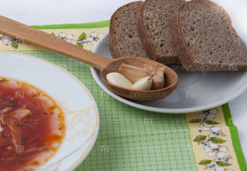 Тарелка борща и тарелка с хлебом на столе