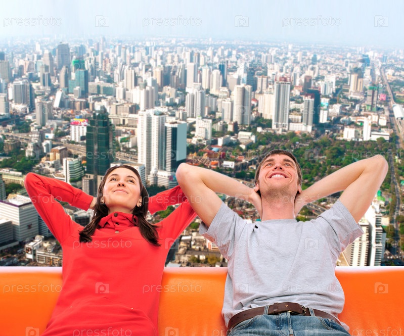Портрет молодой пары, сидящей на диване
