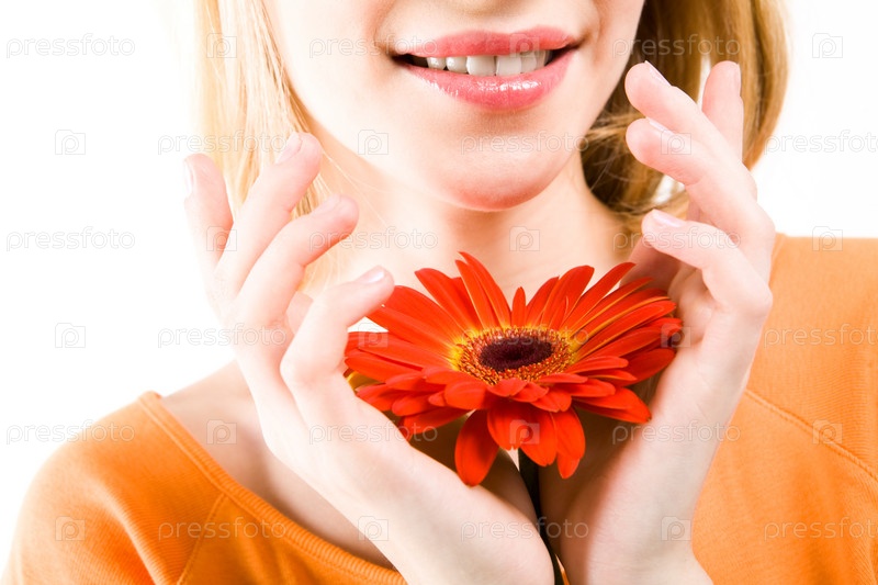 Близкий план женщины, держащей красный красивый цветок в руках и улыбающейся