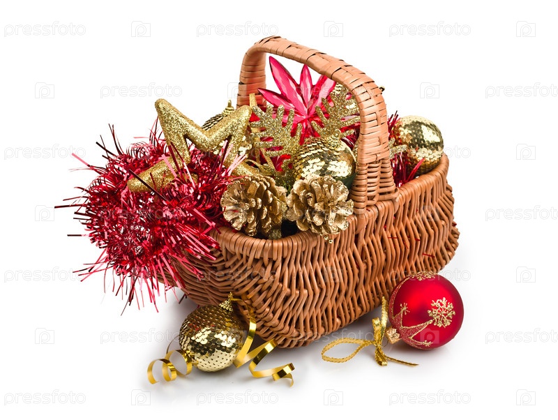 Новогодние украшения в корзине, изолированные на белом фоне