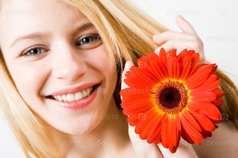 Близкий план веселой молодой женщины, держащей красный красивый цветок в руках и смотрящей на камеру