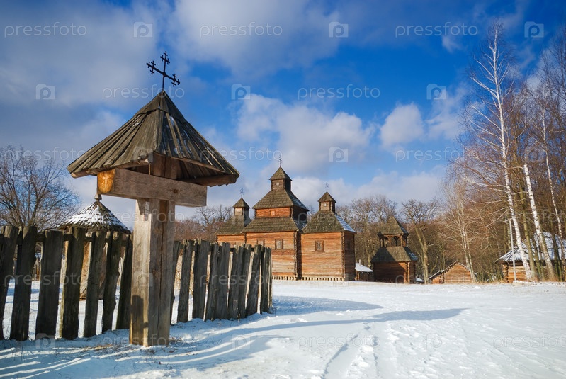 Старый деревянный крест перед сельской церковью