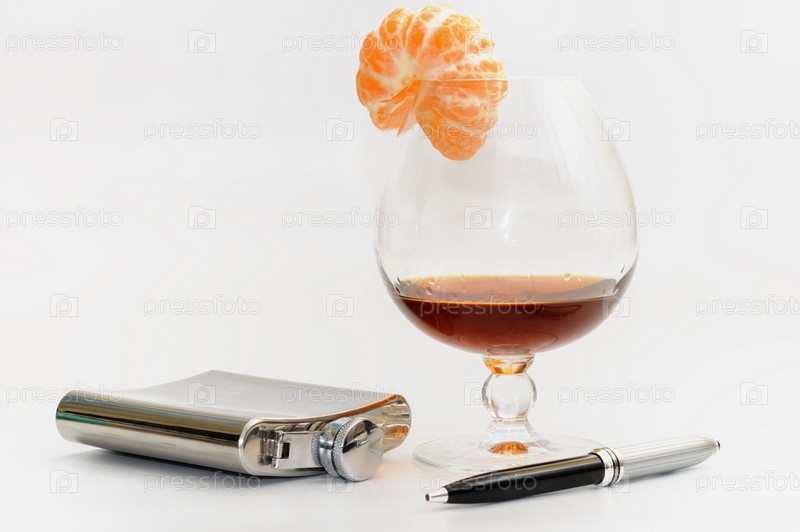 Бокал виски с мандарином и металлической фляжкой и ручкой