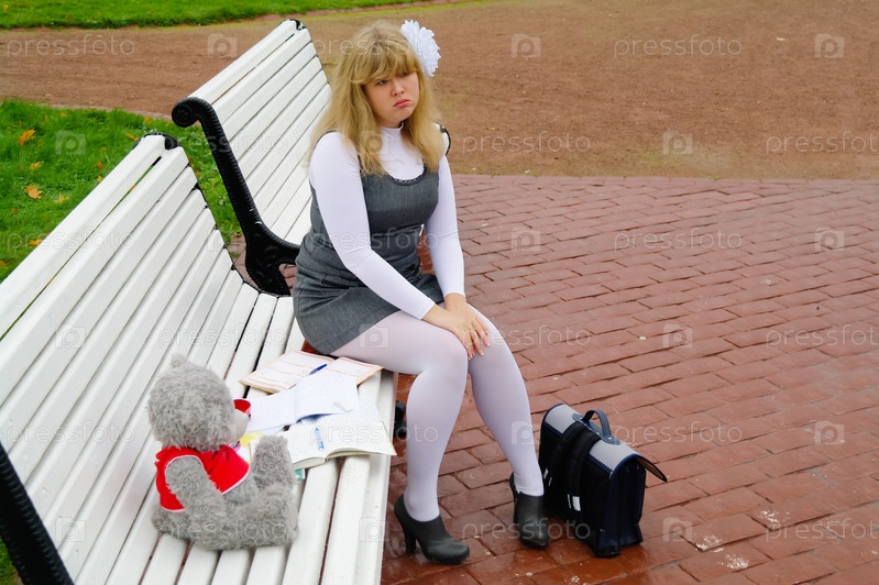 Школьница в форме сидит на белой скамье с портфелем, тетрадями и игрушкой