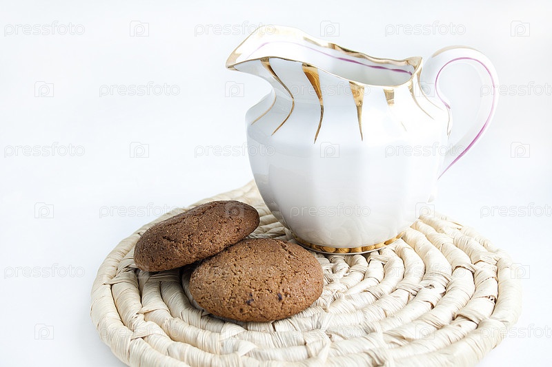 Молочный кувшин и овсяное печенье на плетеной салфетке