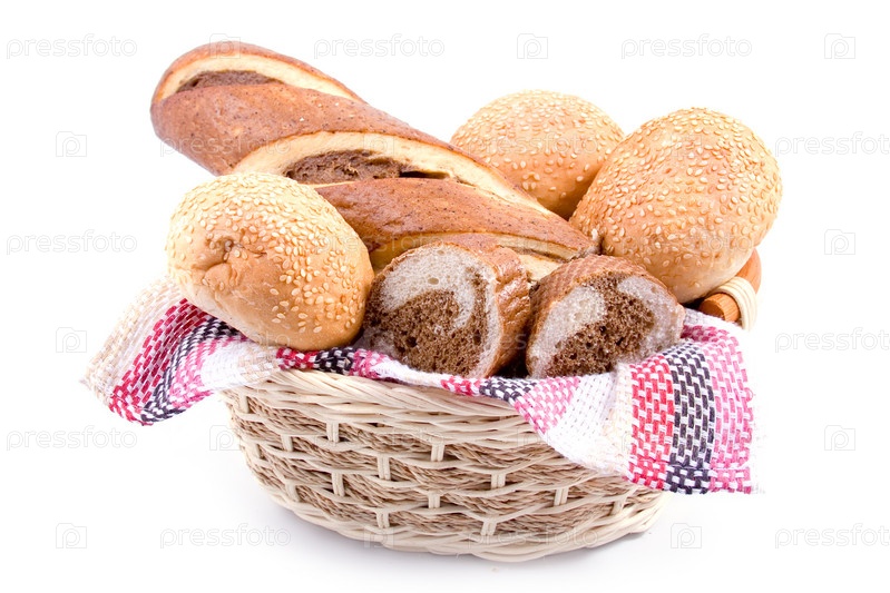 Хлебобулочные изделия в корзине на белом фоне