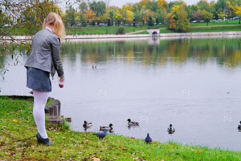 Школьница в форме кормит уток у пруда