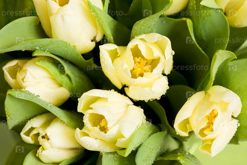 Макросъемка свежих тюльпанов с каплями воды на лепестках и листьях