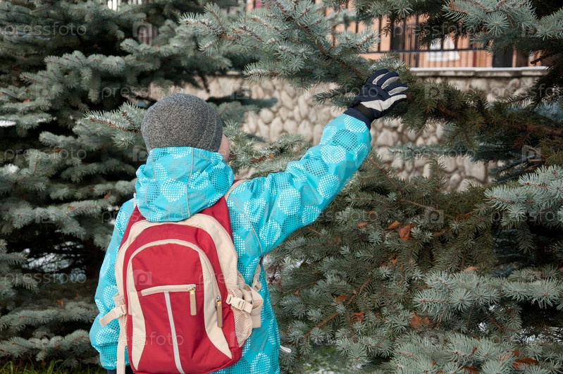Школьник с рюкзаком у елей