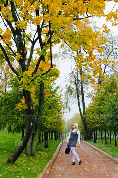 Школьница с портфелем прогуливается по аллее осеннего парка, Москва
