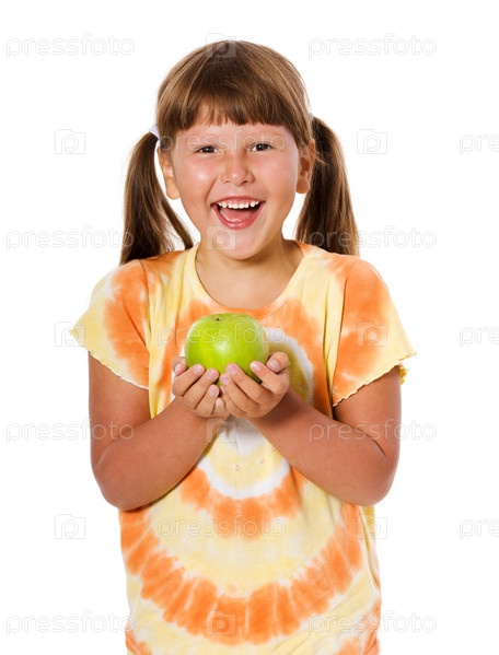Девочка с зеленым яблоком на белом фоне