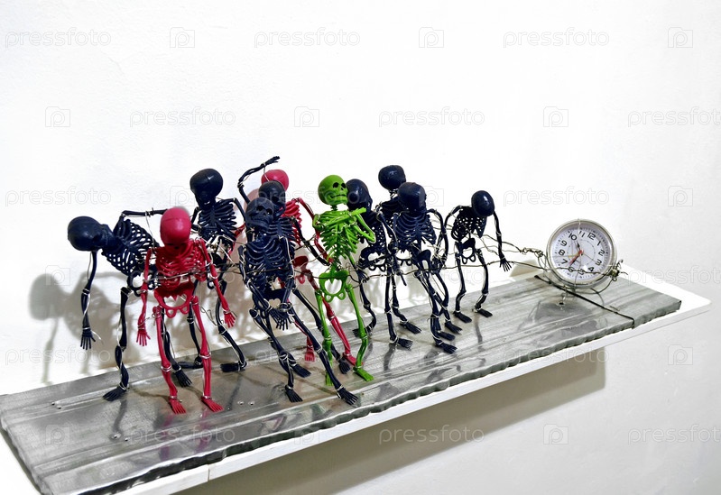 Красочные игрушечные скелеты тянут за собой часы