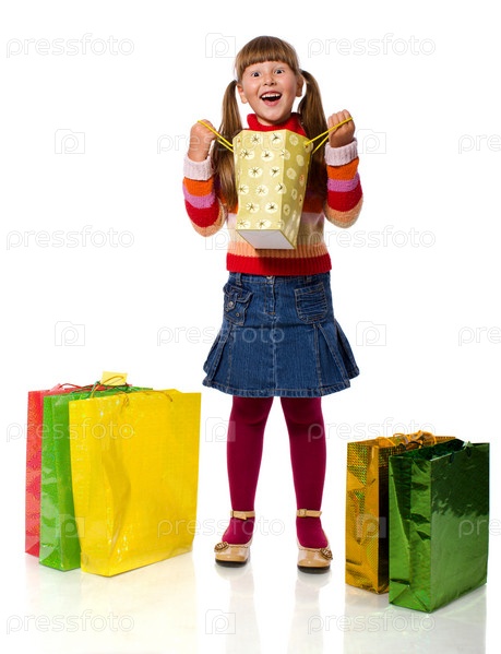 Девочка с подарками на белом фоне