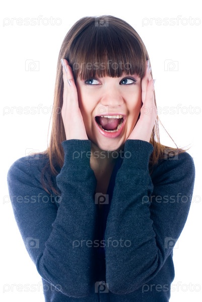 Молодая девушка в сером свитере на белом фоне