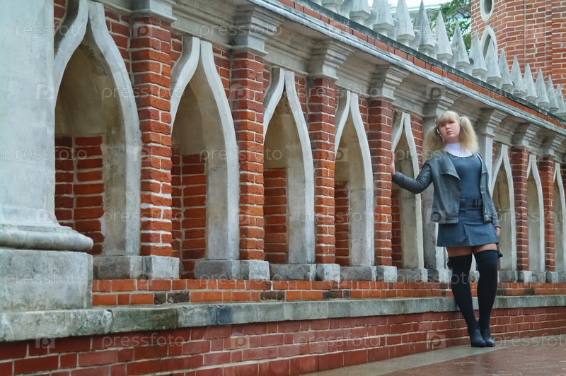 Девушка стоит на ограждении моста с арками, парк, Москва