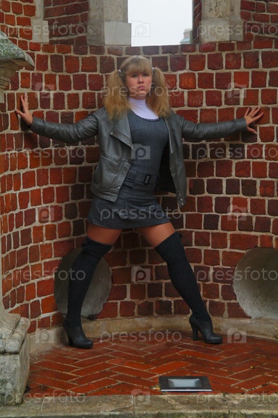 Девушка стоит в круглом кирпичном проеме моста с окном, парк, Москва