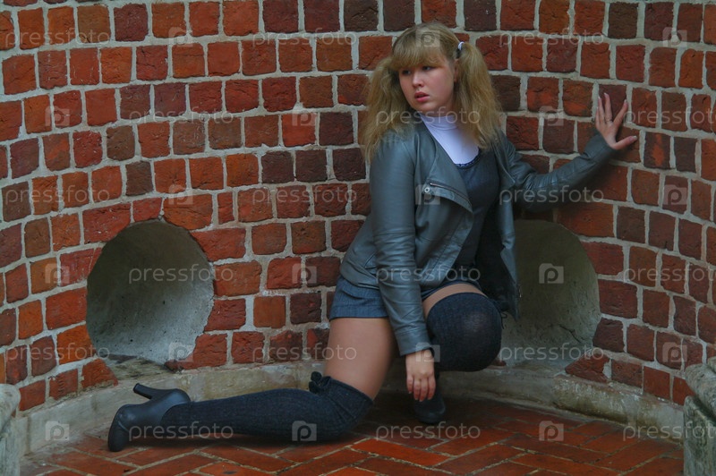 Девушка сидит в круглом кирпичном проеме моста с окном, парк, Москва