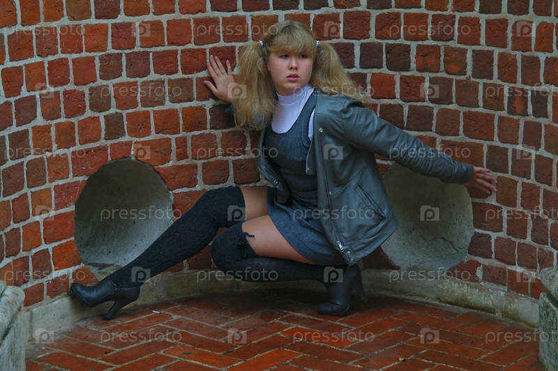 Девушка сидит в круглом кирпичном проеме моста с окном, парк, Москва