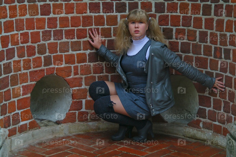 Девушка сидит в круглом кирпичном проеме моста с окном, парк, Москва