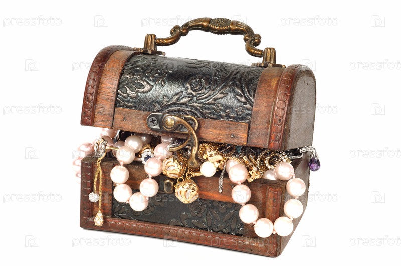 Деревянный сундук с жемчугом и золотом на белом фоне