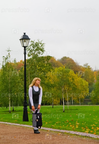 Девушка школьница с портфелем прогуливается по аллее осеннего парка, Москва