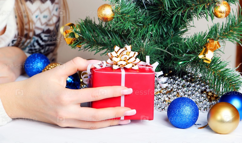 Красочные рождественские украшения и подарок в руке